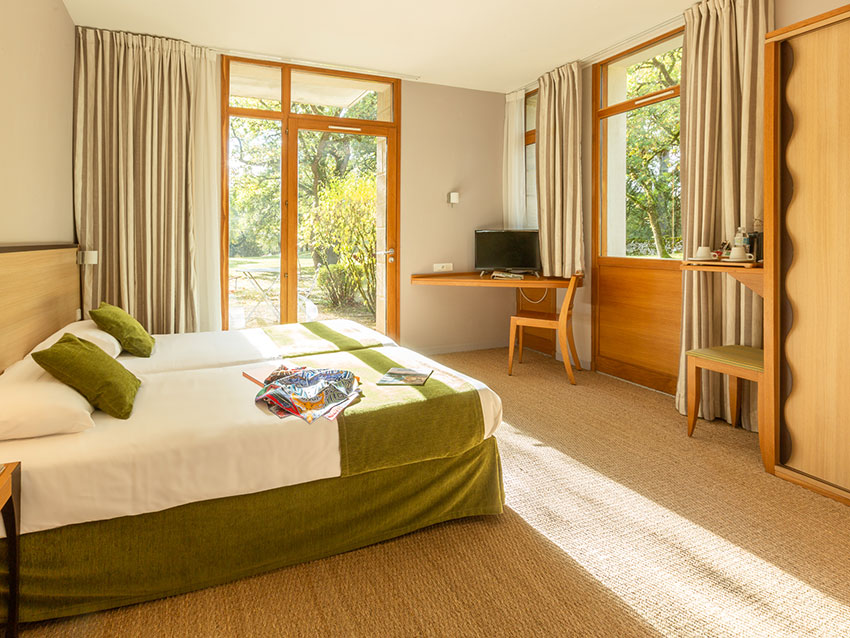 Côté parc, avec douche, deux lits, en rez-de-jardin. Chambre accessible aux personnes à mobilité réduite